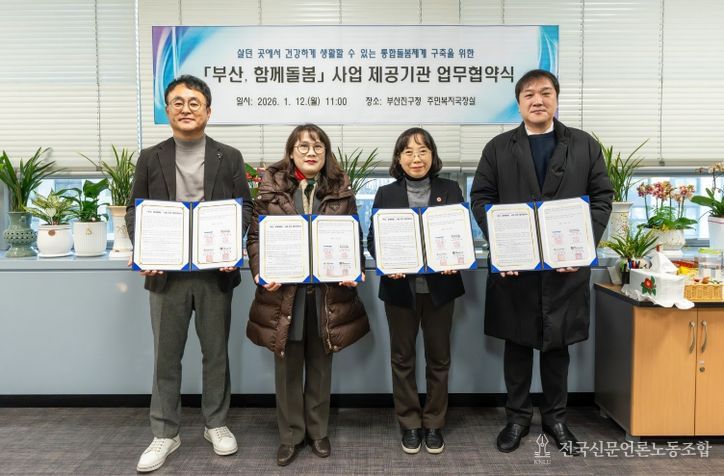 전국신문언론노동조합 이의용 기자 | 부산 부산진구는 지난 12일 ▲부산진시니어클럽 ▲부산진지역자활센터 ▲한국치매돌봄협동조합과 ‘부산, 함께돌봄’ 사업의 상호협력체계 구축을 위한 업무협약을 체결했다.