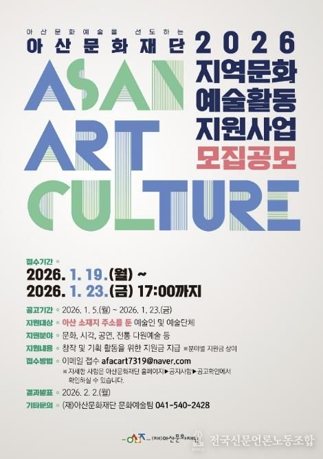 전국신문언론노동조합 강찬희 기자 | (재)아산문화재단은 지역 예술인의 안정적인 창작 환경을 조성하고 문화예술 생태계의 전문성을 강화하기 위해 ‘2026 지역문화예술 활동지원사업’ 공모를 시작한다.