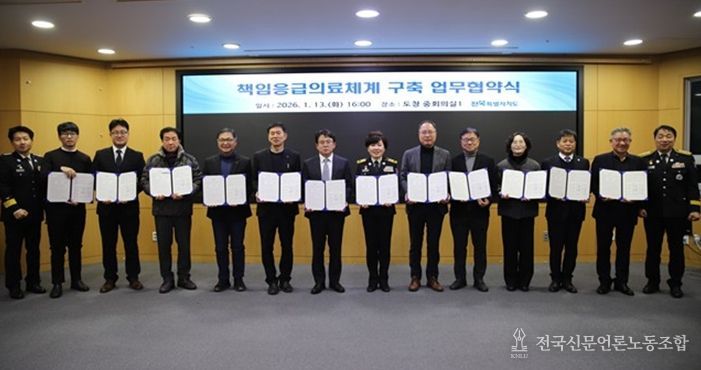 전국신문언론노동조합 김성길 기자 | 전북특별자치도소방본부는 응급환자 수용 지연을 최소화하고 중증응급환자가 신속하고 적정한 치료를 받을 수 있도록, 전북특별자치도 복지여성보건국 및 도내 권역·지역응급의료센터 10곳과 '2026년 책임응급의료체계 구축을 위한 업무협약'을 체결했다.