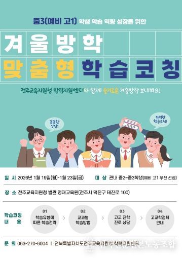 전국신문언론노동조합 김성길 기자 | 전북특별자치도전주교육지원청은 학교급 전환기를 맞은 중학교 3학년 학생들의 학습 공백을 최소화하고, 성공적인 고등학교 안착을 돕기 위해 ‘겨울방학 맞춤형 학습코칭’을 운영한다고 15일 밝혔다.