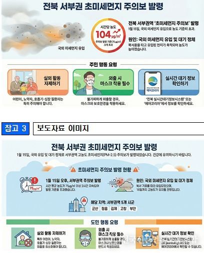 전국신문언론노동조합 김성길 기자 | 전북특별자치도 보건환경연구원은 1월 15일 오후 국외 미세먼지 유입의 영향으로 초미세먼지(PM-2.5) 주의보를 발령했다.