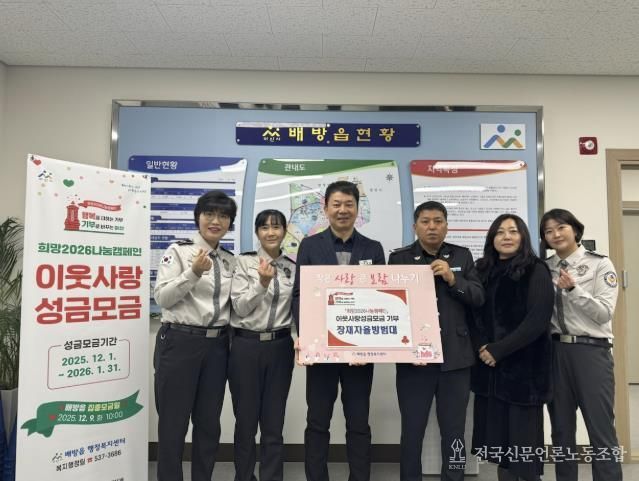 전국신문언론노동조합 강찬희 기자 | 배방읍 장재자율방범대는 지난 15일 배방읍 행정복지센터에서 지역 내 어려운 이웃을 돕기 위한 ‘희망2026 나눔캠페인’에 동참해 성금 100만 원을 전달했다.