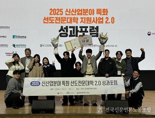 전국신문언론노동조합 강찬희 기자 | 강원도립대학교는 ‘신산업분야 특화 선도전문대학 지원사업 2.0 성과포럼’ 우수성과 전시 시상식에서 대학 부문 우수성과 ‘대상’ 수상과 함께, 소속 학생인 한재민 학생이 개인 부문 사업 성과 대상(교육부 장관상)을 수상하여 대학·개인 2개 부문을 석권했다.