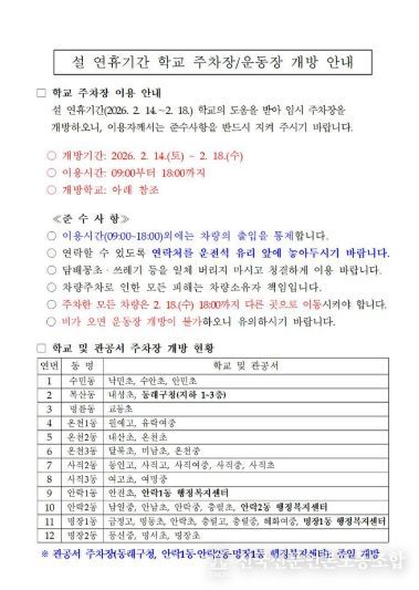 전국신문언론노동조합 이의용 기자 | 부산 동래구는 설 연휴 기간 귀성객의 주차 편의를 위해 2월 14일부터 18일까지(5일간) 학교 및 관공서 37개소의 주차장 또는 운동장을 임시 개방한다고 밝혔다.