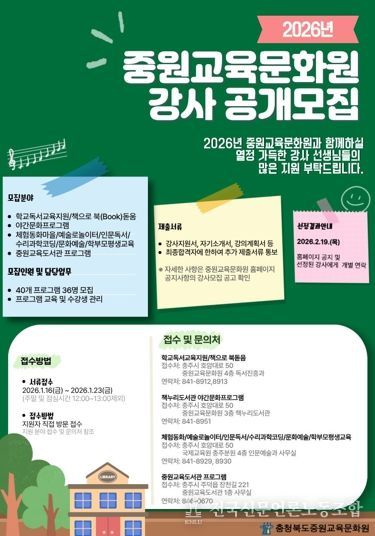 전국신문언론노동조합 김성길 기자 | 충청북도교육청 직속기관 중원교육문화원은 23일까지 학생과 학부모, 지역주민을 대상으로 운영하는 2026년도 인문독서 및 문화예술 프로그램 강사를 공개 모집한다고 밝혔다.