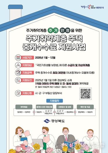 해당 사업은 ‘경상북도 주택의 중개보수에 관한 조례’가 2025년 1월 1일 개정‧시행됨에 따라, 2025년 1월 1일 이후 경상북도에 소재한 1억 원 이하 주택의 매매 또는 임대차(전‧월세) 계약을 체결하고 전입신고를 완료한 주거취약계층을 대상으로 하며, 주거 이전에 소요되는 주택 중개보수 비용을 최대 30만원까지 지원한다.