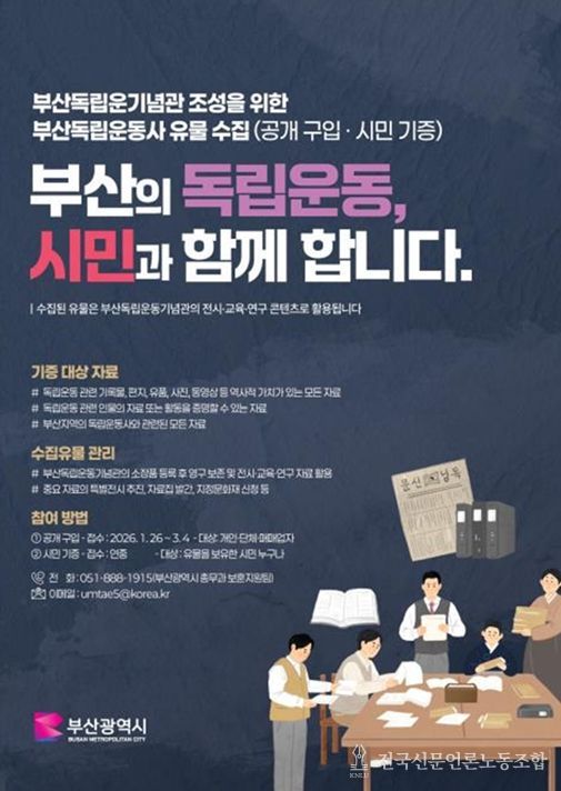 전국신문언론노동조합 조창제 기자 | 부산시는 2027년 상반기 개관을 목표로 조성 중인 부산독립운동기념관의 전시·연구·교육 콘텐츠를 완성하기 위해, 부산 독립운동사 관련 유물 수집을 추진한다고 밝혔다.