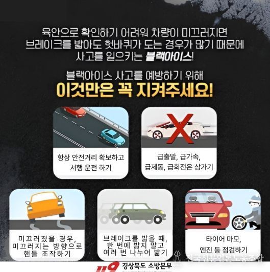 경북소방본부는 블랙아이스 사고 예방을 위해 ▴서행 운전과 충분한 안전거리 확보 ▴급가속·급제동·급회전 자제 ▴차량 미끄러짐 발생 시 미끄러지는 방향으로 핸들 조작 ▴타이어 마모 상태 등 차량 사전 점검 ▴스노우체인·스노우타이어 사용 등 겨울철 안전 수칙을 철저히 지켜줄 것을 당부했다.
