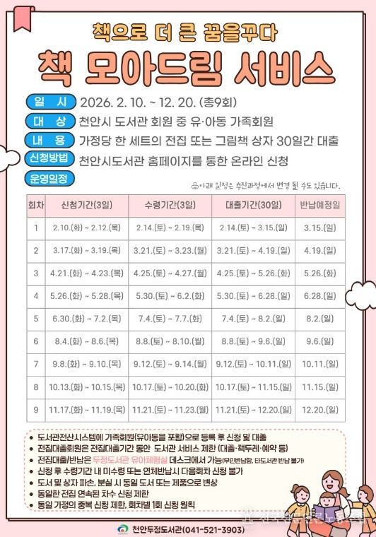 참여를 희망하는 가정은 천안시도서관 누리집을 통해 온라인으로 신청하면 된다.