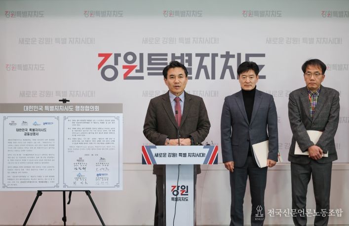 전국신문언론노동조합 강찬희 기자 | 강원, 제주, 세종, 전북으로 구성된 ‘대한민국특별자치시도 행정협의회’(대표회장 : 김진태 강원특별자치도지사)는 1월 21일 4개 특별자치시‧도의 특별법안 조속한 통과와 광역 행정통합 인센티브 부여에 따른 역차별 우려를 담은 공동성명서를 발표했다.