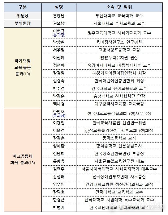 위원으로는 학계·연구원·교육현장 등 다양한 분야의 전문가 48명이 위촉됐다. 전체 위원장은 이재명 정부 국정기획위원회 사회2분과장(교육분야 총괄)을 역임한 홍창남 교수(부산대학교)가 맡아, 정책자문위원회에서 제시하는 교육정책 관련 의견이 국정과제와 밀접한 연관성을 지닐 수 있도록 했다.