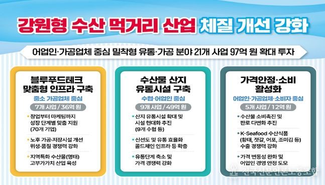 전국신문언론노동조합 강찬희 기자 | 강원특별자치도는 수산 먹거리 산업을 단순 생산 중심 구조에서 벗어나 가공·유통·소비로 이어지는 블루푸드테크(Blue Food-Technology) 산업화와 연계해 총 21개 사업, 97억 원 규모의 종합 지원책을 본격 추진한다.