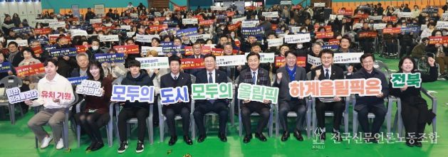 전국신문언론노동조합 김성길 기자 | 전북특별자치도는 26일 전주화산체육관에서 전북 장애인체육회 회원 등 1,000여 명이 참석한 가운데 전주 하계올림픽·패럴림픽 홍보대사 및 홍보서포터즈 위촉식을 개최했다.