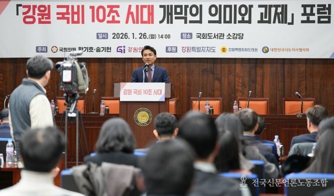 전국신문언론노동조합 강찬희 기자 | 강원특별자치도는 1월 26일 오후 2시 한기호(강원 춘천・철원・화천・양구을) ・송기헌(강원 원주을) 국회의원과 강원연구원이 공동 주최한 ‘국비 10조 시대 개막의 의미와 과제’ 포럼을 개최했다고 밝혔다.