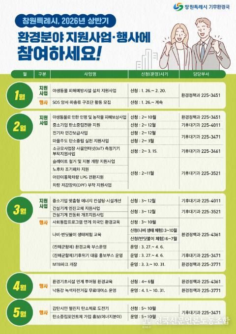 전국신문언론노동조합 강찬희 기자 | 창원특례시는 2026년 새해를 맞아 환경분야 각종 지원사업과 탄소중립을 위한 시민 참여 행사를 다채롭게 추진한다고 밝혔다.
