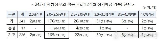 전국 243개 지방정부의 금고 이자율을 조사한 결과, 12개월 이상 정기예금 금리는 전국 평균 2.53%(공개 이자율 기준)로 집계됐다.