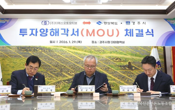 경주시는 29일 시청 대외협력실에서 경북도와 함께 자동차 차체 부품 전문기업 ㈜티에스오토모티브 간 전기차 신차종 제품 생산라인 구축을 위한 투자양해각서(MOU)를 체결했다.
