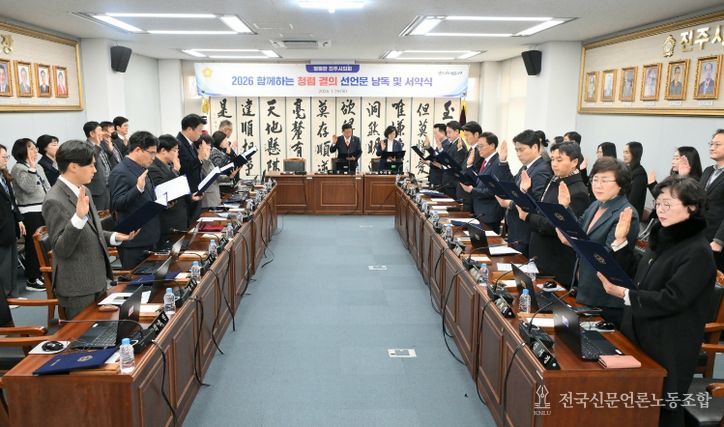 전국신문언론노동조합 강찬희 기자 | 진주시의회는 29일 제271회 임시회를 앞두고 청렴한 의정 실천을 위한‘2026 함께하는 청렴결의 선언문 낭독 및 서약식’을 개최했다.