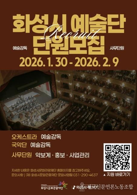 전국신문언론노동조합 기자 | (재)화성시문화관광재단은 2026년 ‘화성시 예술단’을 이끌어갈 예술감독과 사무단원을 모집한다.