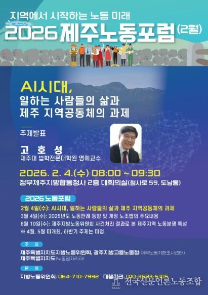 첫 포럼에서는 제주대 법학전문대학원 고호성 명예교수가 ‘인공지능(AI) 시대, 일하는 사람들의 삶과 제주 지역공동체의 과제'를 주제로 발표한다.