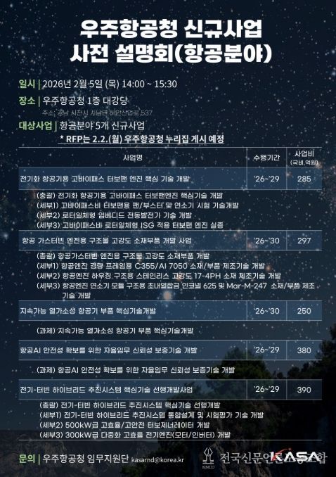 전국신문언론노동조합 강찬희 기자 | 우주항공청은 2월 5일 오후 2시, 사천 우주항공청 1층 대강당에서 2026년 항공분야 신규사업의 주요 내용을 공유하고, 산·학·연 연구자의 적극적인 참여와 심도 있는 이해를 돕기 위한 사전설명회를 개최한다고 밝혔다.