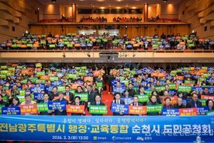전국신문언론노동조합 강찬희 기자 | 순천시는 전라남도와 함께 3일 순천문화예술회관에서 전남광주특별시 행정·교육 통합 도민 공청회를 개최하고, 통합 추진의 방향과 핵심 과제를 시민과 함께 논의했다.