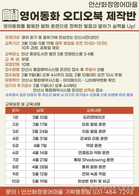 전국신문언론노동조합 김성길 기자 | 안산시가 설립하고 안산대학교가 운영하는 안산화정영어마을이 성인 영어 학습자를 위한 ‘영어동화 오디오북 제작반’을 3월부터 5월까지 10주 과정으로 안산시 중앙도서관에서 운영한다고 4일 밝혔다.