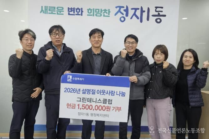 전국신문언론노동조합 김성길 기자 | 수원시 장안구 정자1동은 지난 3일, 그린테니스클럽이 설 명절을 맞아 관내 취약계층을 돕기 위한 기부금 150만원을 전달했다고 밝혔다.