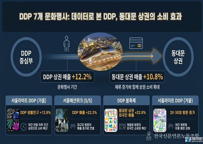 서울AI재단은 이번 분석을 통해 DDP 문화행사가 특정 시점의 방문 증가에 그치지 않고, 체류 시간 확장과 소비 활동으로 이어지며 DDP 내부는 물론 동대문 상권 전반의 매출 증가를 견인하고 있음을 데이터로 확인했다고 밝혔다. 행사 유형에 따라 소비 주체와 시간대는 차이를 보였으나, 공통적으로 상권 매출 상승이 동반됐으며, 특히 외국인 방문객과 야간 관람객의 소비 확대가 두드러진 점이 특징으로 나타났다. 이는 DDP 문화행사가 도시 문화 소비를 상권 활성화로 연결하는 실질적 효과를 갖고 있음을 보여주는 분석 결과다.