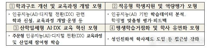 교육부는 2026년 신규 사업 공모를 통해 총 24개 내외 사업단(전문대학)을 선정하여 사업단별 최대 10억 원(총 240억 원)을 지원할 예정이다. 주요 추진 내용으로는 ▲인공지능(AI)·디지털 전환(DX) 환경 조성, ▲재학생·교직원·지역주민 맞춤형 인공지능(AI) 역량 강화, ▲대학별 특화모형 구축이 있다.