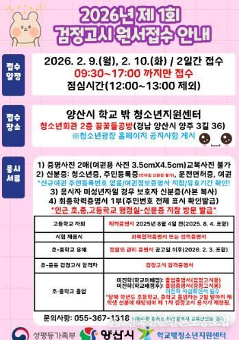 전국신문언론노동조합 강찬희 기자 | 양산시 학교 밖 청소년지원센터는 학교 밖 청소년들의 2026년 제1회 검정고시 응시를 지원하기 위해 대리 원서접수처를 운영한다.