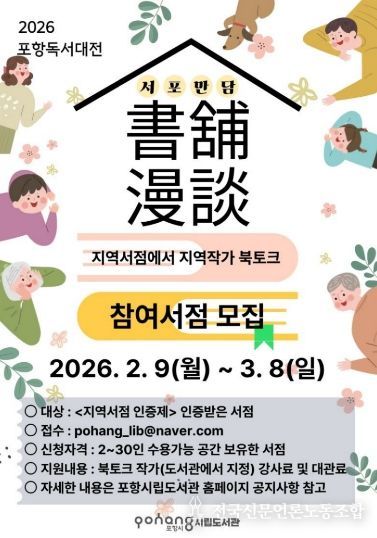 전국신문언론노동조합 강찬희 기자 | 포항시는 오는 9일부터 내달 8일까지 ‘2026 포항독서대전’ 연간 프로그램인 ‘서포만담(書舖漫談)’에 참여할 지역 서점을 모집한다.