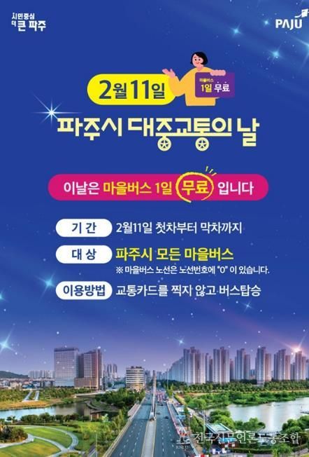 전국신문언론노동조합 김성길 기자 | 파주시는 ‘대중교통의 날’을 맞아 대중교통 이용 활성화와 시민 교통비 부담 완화를 위해 오는 2월 11일 하루 동안 파주시 전 지역의 모든 마을버스를 무료로 운행한다.
