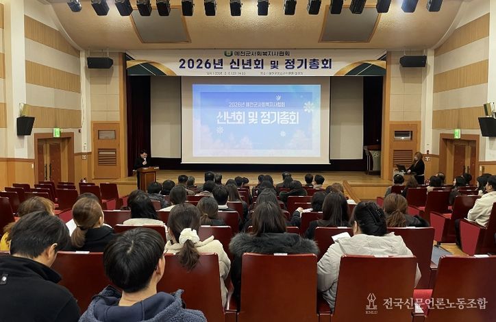 전국신문언론노동조합 강찬희 기자 | 예천군사회복지사협회(협회장 황은정)는 지난 6일 예천군 청소년수련관 대강당에서 관내 복지시설 종사자 및 관계자 100여 명이 참석한 가운데 2026년 신년회 및 정기총회를 개최했다.