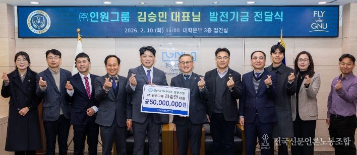 전국신문언론노동조합 강찬희 기자 | 경상국립대학교는 2월 10일 오전 11시 대학본부 접견실에서 수의과대학 발전을 위한 ㈜인원그룹(대표 김승민) 기금 전달식을 개최했다.
