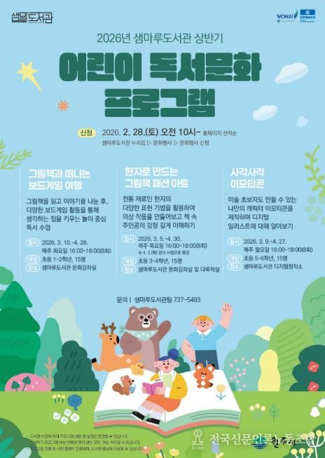 전국신문언론노동조합 강찬희 기자 | 원주시 샘마루도서관은 오는 3월과 4월, 관내 어린이를 대상으로 ‘상반기 어린이 독서문화 프로그램’을 운영한다.