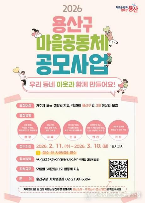 전국신문언론노동조합 강찬희 기자 | 서울 용산구는 주민 주도의 지역 문제 해결을 지원하기 위해 ‘2026년 용산구 마을공동체 공모사업’ 참여자를 모집한다.