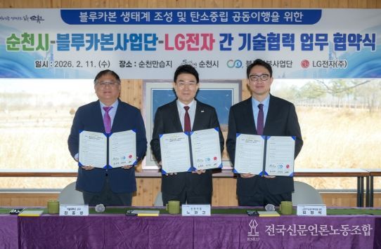전국신문언론노동조합 강찬희 기자 | 순천시는 11일 순천만습지에서 서울대 블루카본사업단, LG전자(주)와 함께 '블루카본 생태계 조성 및 탄소중립 공동 이행을 위한 업무협약'을 체결했다고 밝혔다.