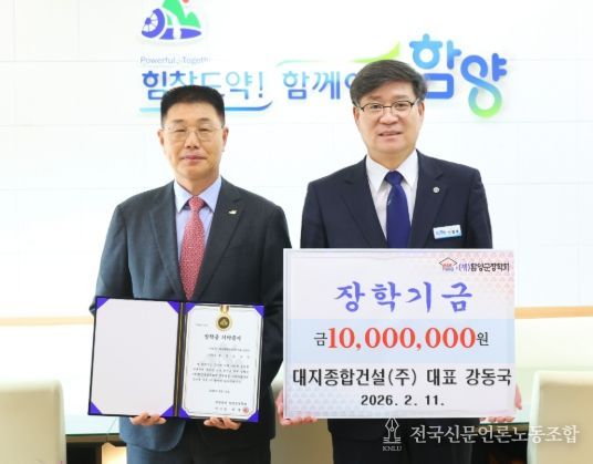 전국신문언론노동조합 강찬희 기자 | (재)함양군장학회는 2월 11일 대지종합건설(주) 강동국 대표가 함양군 지역 학생들을 위해 장학금 1,000만 원을 기탁했다고 밝혔다.