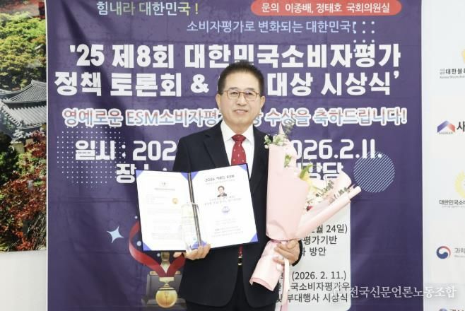 전국신문언론노동조합 강찬희 기자 | 지난 11일, 국회 도서관에서 열린 2026 제8회 ESM대한민국소비자평가우수대상 정책토론회 및 시상식에서 광주시의회 허경행 의장이 지방자치/행정 부문 대상을 수상했다.