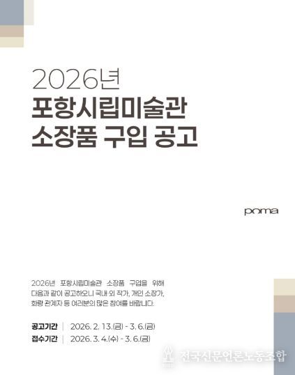 전국신문언론노동조합 강찬희 기자 | 포항시립미술관은 13일부터 내달 6일까지 ‘2026년 포항시립미술관 소장품 구입 공고’를 진행한다.