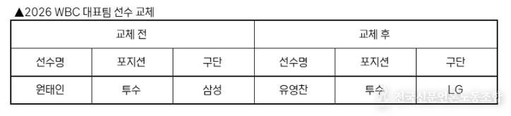 전국신문언론노동조합 강찬희 기자 | KBO 전력강화위원회는 부상으로 인해 WBC 참가가 어려워진 삼성 원태인을 대체할 선수로 LG 유영찬을 확정하고 WBC 조직위에 선수 교체 승인을 요청했다.