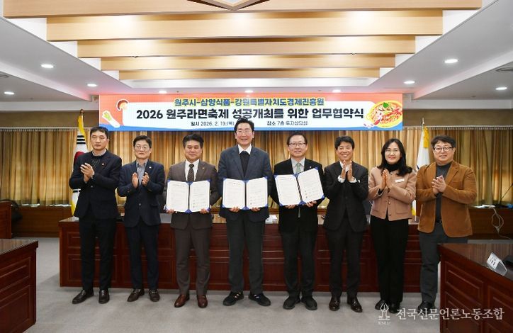 전국신문언론노동조합 강찬희 기자 | 원주시는 ‘2026 원주라면축제’의 성공적인 개최를 위해 19일 오후 2시, 시청 7층 투자상담실에서 삼양식품, 강원특별자치도경제진흥원과 업무협약을 체결했다.