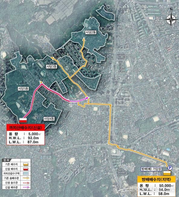 구는 사당동 일대가 재개발‧재건축 등 도시정비사업으로 인해 향후 급격한 인구 증가가 예상되는 만큼, 사전에 미리 까치산배수지 건설 사업을 추진하고 있는 것이다.