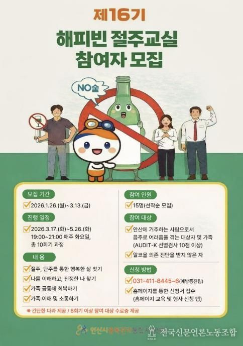 전국신문언론노동조합 김성길 기자 | 안산시 중독관리통합지원센터는 내달 13일까지 ‘제16기 해피빈 절주교실’ 참여자를 모집한다고 23일 밝혔다.