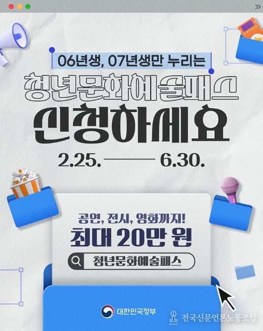 전국신문언론노동조합 강찬희 기자 | 06년생, 07년생만 누리는 '청년문화예술패스' 신청하세요.