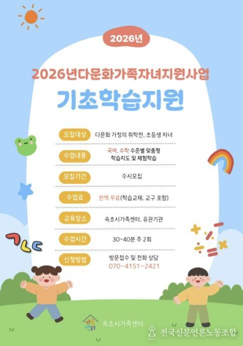 전국신문언론노동조합 강찬희 기자 | 속초시가족센터는 다문화가족 자녀들의 안정적인 학교생활 적응과 기초학력 증진을 위해 ‘2026년 다문화가족 자녀 기초학습지원사업’을 본격적으로 추진한다.