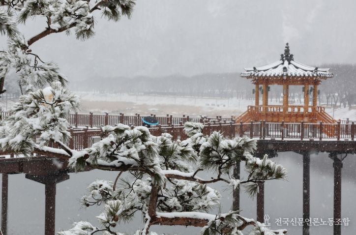 내린 눈으로 동진천 산책로와 소나무 가로수길은 순식간에 은빛 풍경으로 변했다. 길게 늘어선 소나무 가지마다 눈꽃이 피어나 장관을 이루고있다