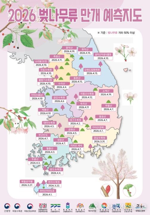 전국신문언론노동조합 강찬희 기자 | 산림청은 봄철 생강나무, 진달래, 벚나무류의 개화 시기를 담은 ‘2026년 봄철 꽃나무 개화 예측지도’를 발표하며, 올 봄철(3~4월) 기온이 평년보다 높을 것으로 전망돼 개화 시기가 지난해보다 다소 앞당겨질 것으로 예상된다고 24일 밝혔다.
