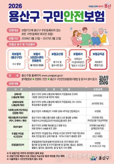 전국신문언론노동조합 강찬희 기자 | 서울 용산구가 2026년에도 전 구민을 대상으로 ’구민안전보험’을 확대 운영한다.